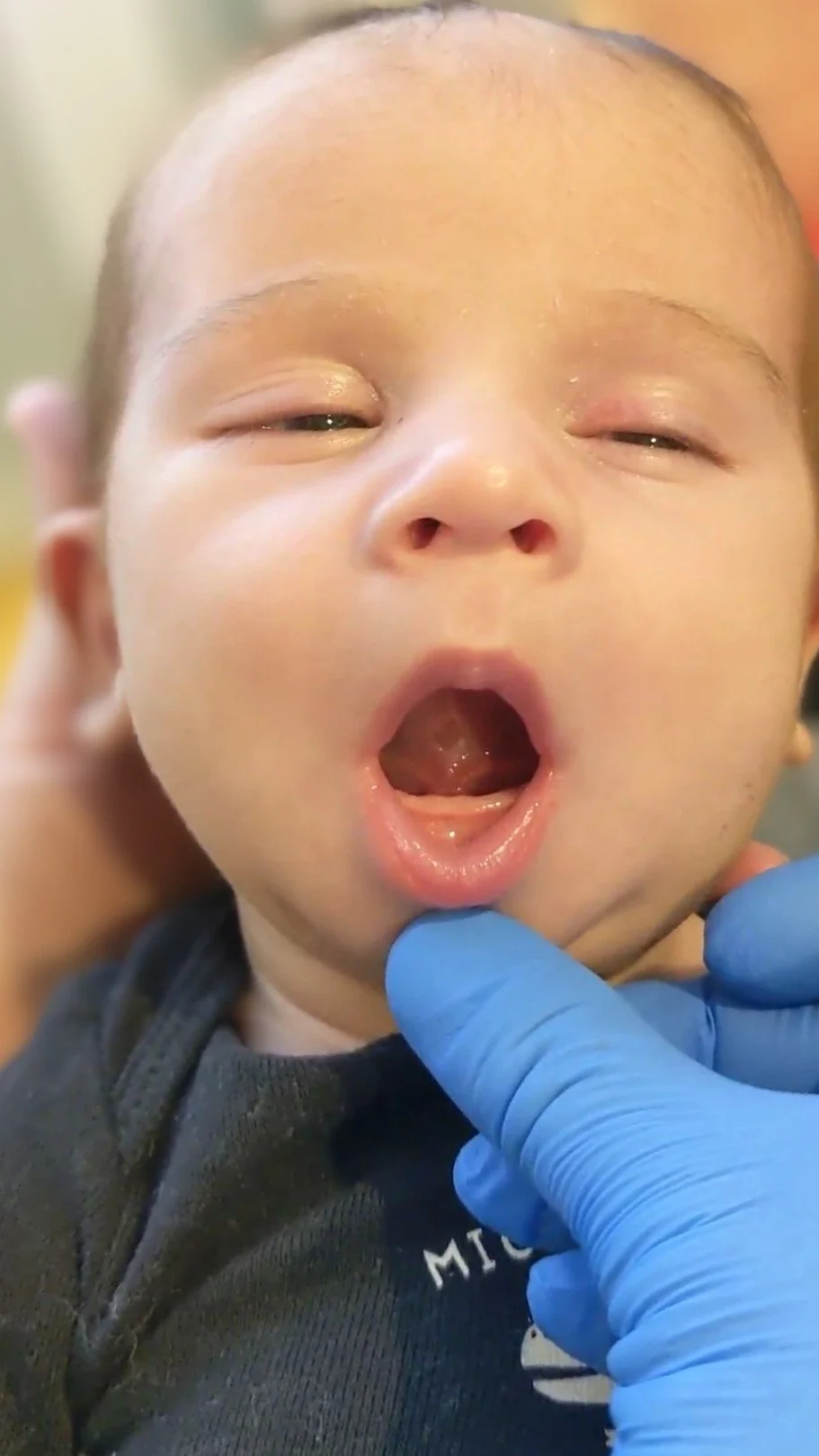 Coming from behind baby’s head, stabilize the lower jaw with your middle finger and lip with your thumb. Place your finger (nail side up) on the floor of the mouth near the bone. “Scoop” your finger through the wound front to back and then side to side. This should be done every 6 hours including at least once at night time for at least 2-4 weeks depending on healing.